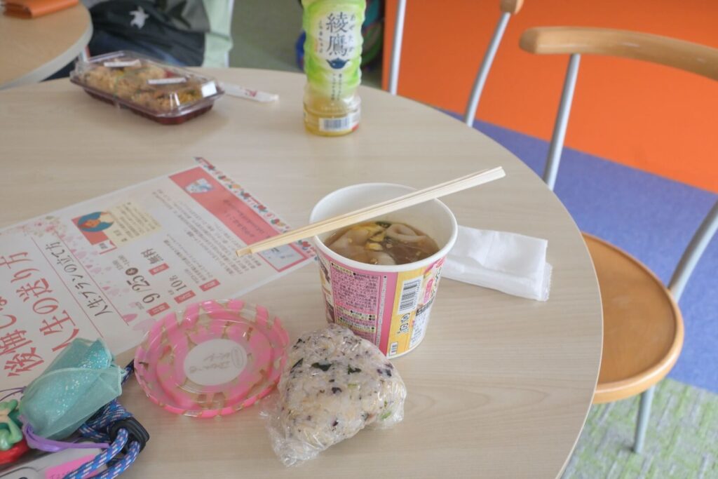 私と反対に、ガッツリ派の方もいらっしゃいました。それだけで充分お腹がいっぱいになりそうなお弁当に、カップ焼きそばの超大盛を追加!!「一体何キロカロリーになるんやろう」と盛り上がってました。
