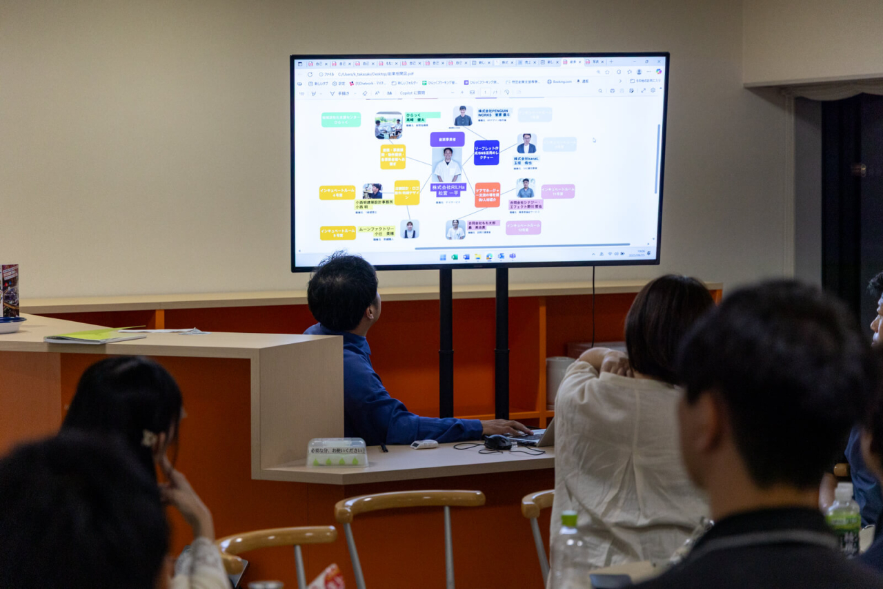 今回参加されたのは、「ひらっくコワーキングスペース」や「インキュベートルーム」にオフィスを構えている方々です。まずは、お互いのことを知ってもらおうということで、一人3分程度で自己紹介していただきました。すでに起業されている方がほとんどだったので、みなさんご自身の事業についてプレゼンテーションされていました。