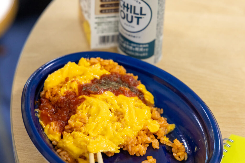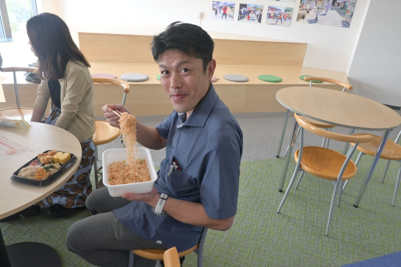 ご飯は各自が持ち寄る形式です。手作りのお弁当、ファストフード、コンビニ弁当、カップ麺などさまざま。