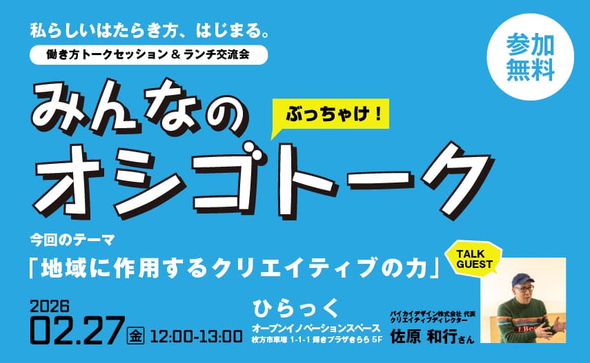 「みんなのオシゴトークinひらっく」では、枚方で事業をされている方、フリーランスで活動されている方などをお呼びして、人生のターニングポイントについてお聞きします。ランチ会と同じく、お食事しながらリラックスして聞いていただけるイベントです。お気軽にご参加ください!!