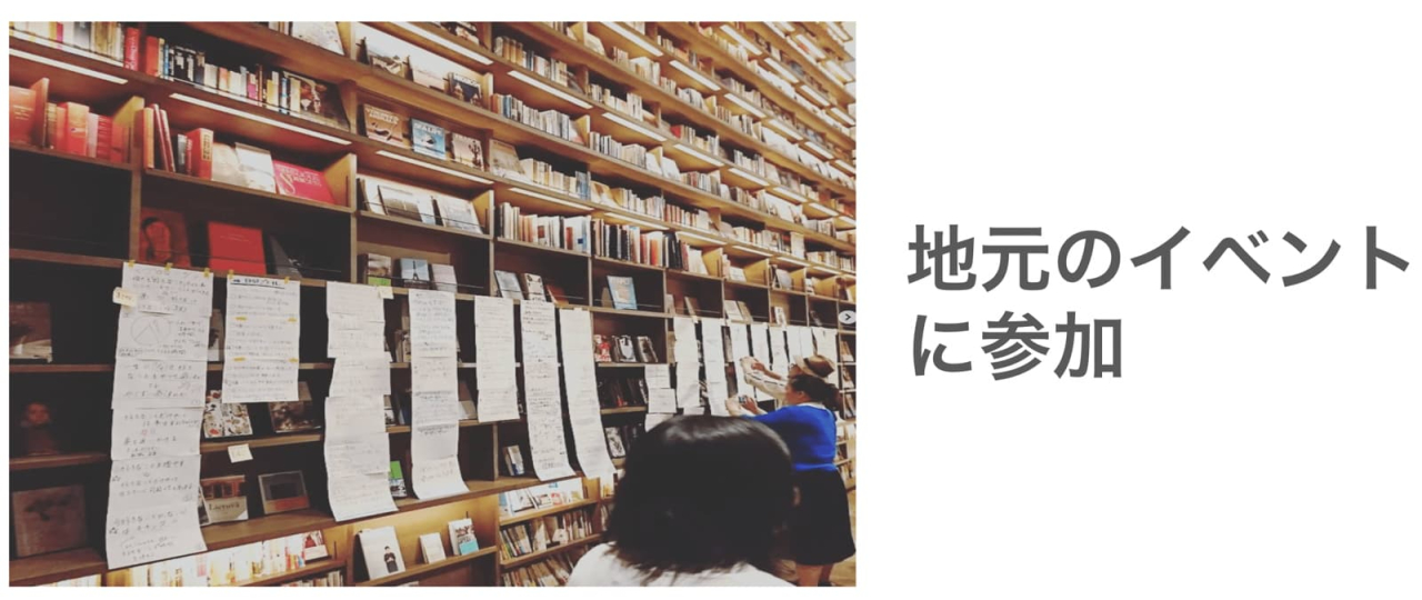1枚目は、地元のイベントに参加と書かれたスライドです。ここでは、枚方T-SITEで開催されたイベントが紹介されていました。元TBSプロデューサー角田陽一郎さんの著書『「好きなことだけやって生きていく」という提案』を題材にした読書会です。