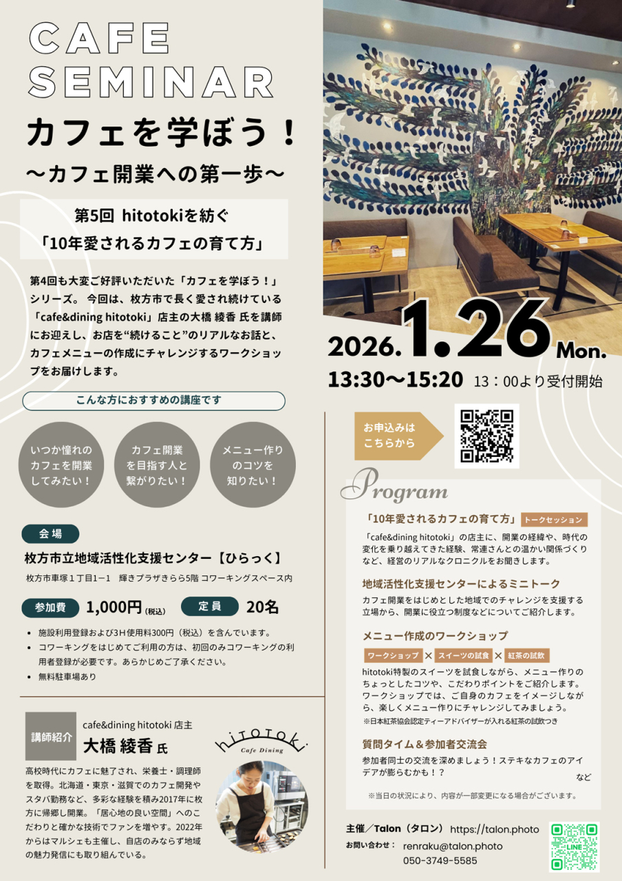 ・「10年愛されるカフェの育て方」トークセッション 枚方で8年以上続く「cafe&dining hitotoki」店主に、開業の経緯や、時代の変化を乗り越えてきた経験、常連さんとの温かい関係づくりなど、経営のリアルなクロニクルをお聞きします。