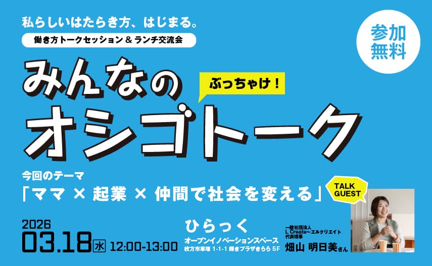 2026年3月18日(水) 12:00〜13:00に、ひらっくコワーキングスペースのオープンイノベーションスペースにて「みんなのオシゴトークinひらっくVol.3〜ママ×起業×仲間で社会を変える」を開催します。