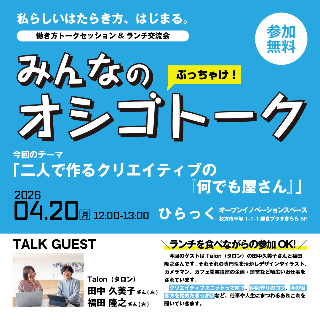 2026年4月20日(月) 12:00〜13:00に、ひらっくコワーキングスペースのオープンイノベーションスペースにて「みんなのオシゴトークinひらっくVol.4〜二人で作るクリエイティブの『何でも屋さん』」を開催します。
